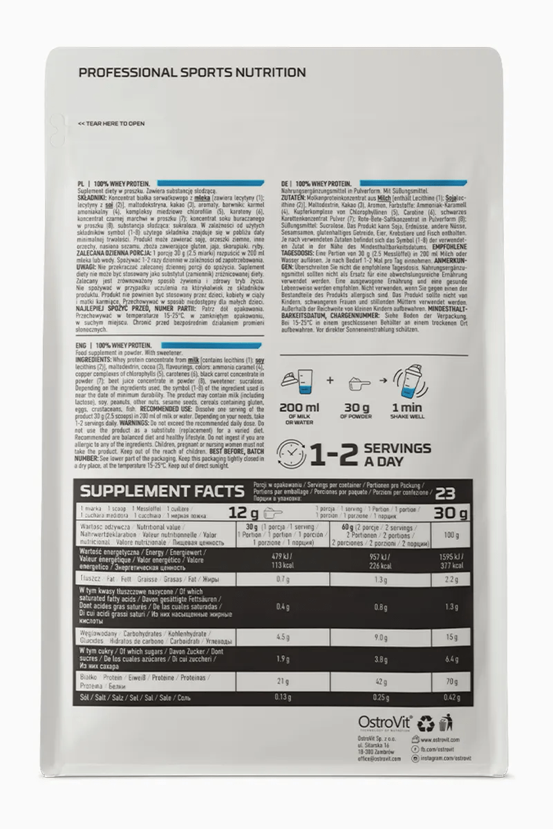OstroVit 100% WHEY PROTEIN er proteintilskudd av høyeste kvalitet som inneholder 70% proteiner. Dette kosttilskuddet passer for alle idrettsutøvere, uavhengig av idrettsdisiplin. Det anbefales spesielt i perioden med å bygge muskelmasse og redusere kroppsfett. Den kan brukes under avansert trening, men også som en ingrediens i et daglig kosthold for å supplere næringsverdiene.