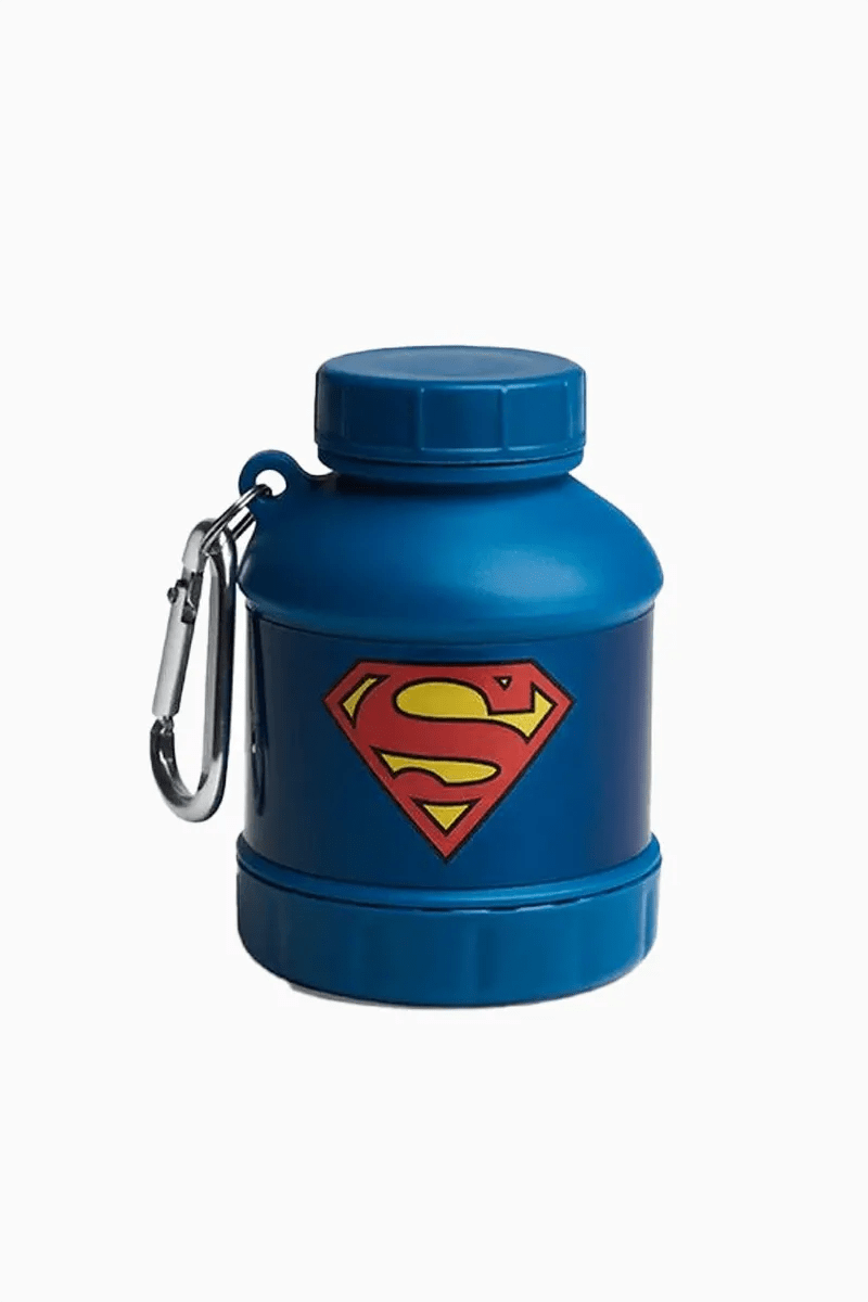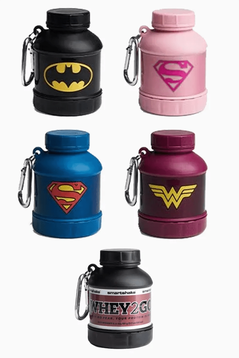 Større er ikke alltid bedre. Whey2Go er den smarte måten å ta med tilskuddene dine på. Med denne smarte oppbevaringen og trakten i ett slipper du søl og kan ta med deg tilskuddene dine på en enkel måte. Dette er det ultimate tillegget på nøkkelknippet! Velg din favoritt med motiv fra superhelter som Superman, Batman, Supergirl og Wonder Woman.